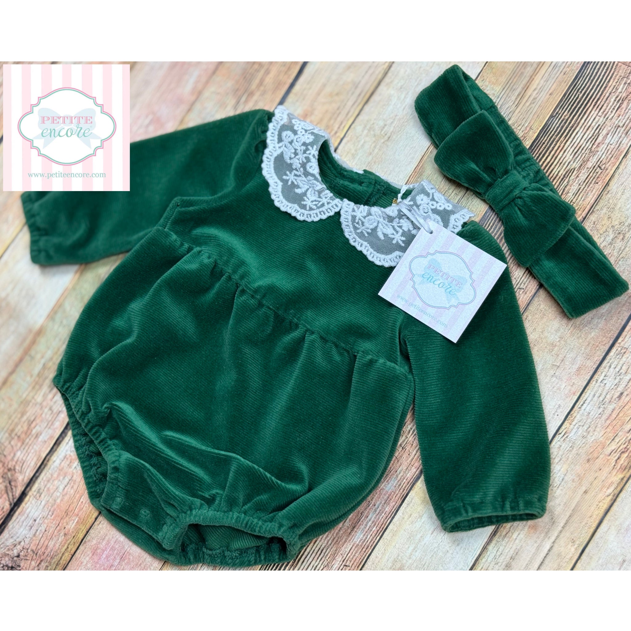 Beautiful soft velour emerald green bubble with matching headband by Little Me -size 6 months