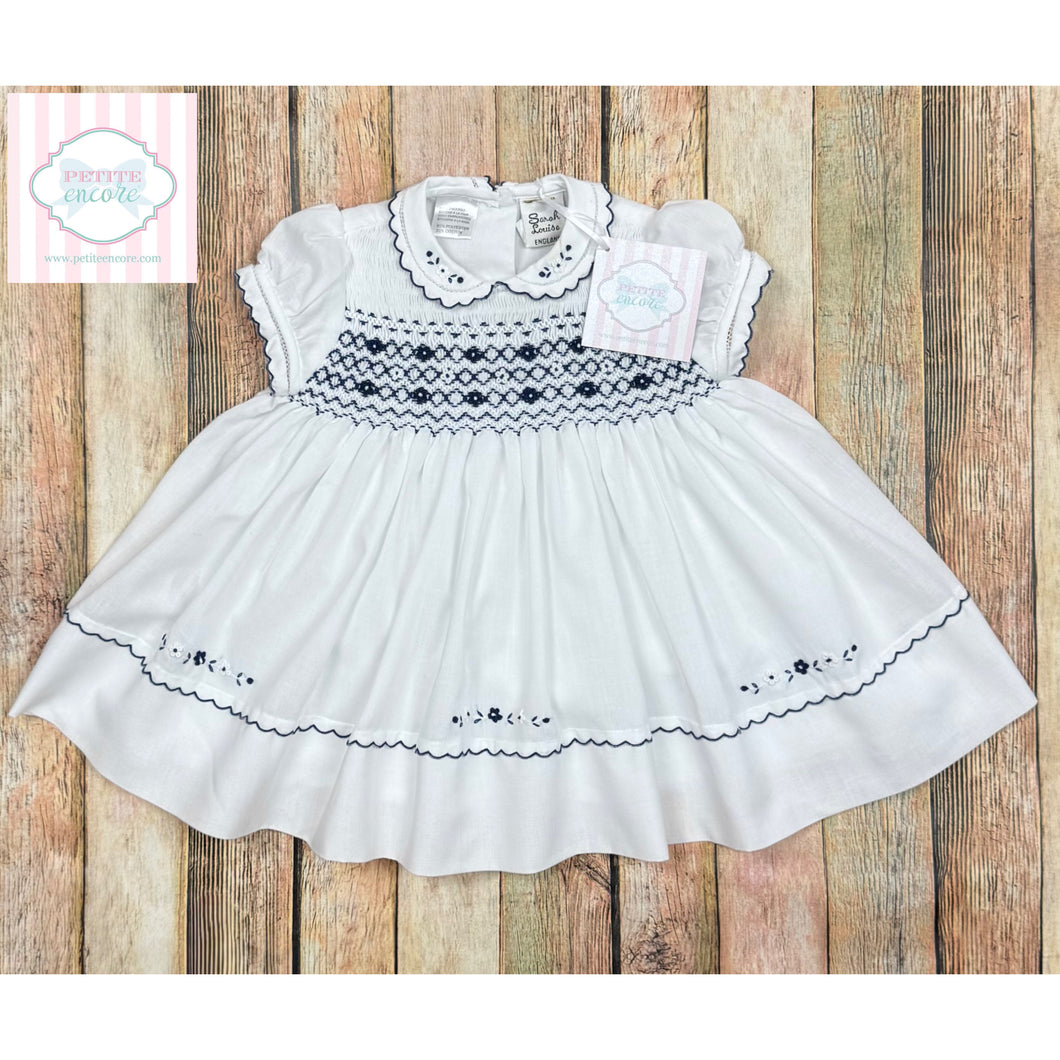 Classic and beautiful navy and white smocked dress by Sarah Louise, England- size 6 months